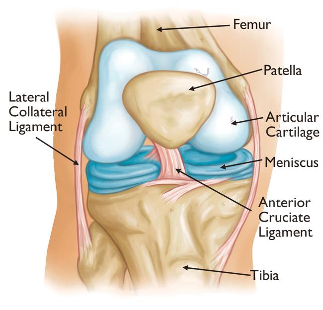 The knee is made up of the lower end of the thighbone (femur), the upper end of the shinbone (tibia), and the kneecap (patella). The ends of these three bones are covered with articular cartilage, a smooth substance that protects the bones and enables them to move easily within the joint.